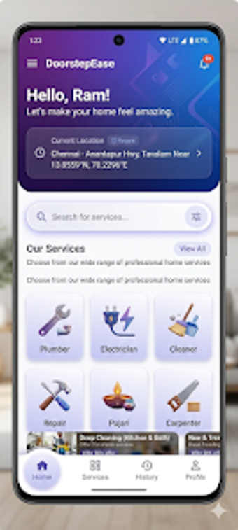 DoorstepEase เป็นแอปพลิเคชันมือถือที่ใช้งานง่ายออกแบบมาสำหรับผู้ใช้ Android โดยทำให้กระบวนการจองบริการที่บ้านต่างๆ ง่ายขึ้น ตั้งแต่การประปาและงานไฟฟ้าไปจนถึงการทำความสะอาดและบริการทางจิตวิญญาณ แอปนี้เชื่อมต่อผู้ใช้กับมืออาชีพที่ได้รับการตรวจสอบ ทำให้มั่นใจได้ว่าประสบการณ์ที่เชื่อถือได้ แพลตฟอร์มนี้มุ่งเน้นไปที่การทำให้การจองบริการเป็นเรื่องง่ายและมีประสิทธิภาพ ช่วยให้ผู้ใช้สามารถจัดการความต้องการในการบำรุงรักษาบ้านได้อย่างง่ายดาย
